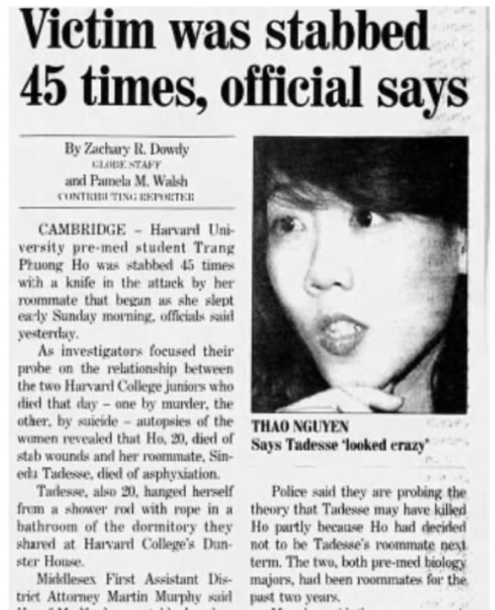 Trang was a Vietnamese student who, like Sinedu, attended Harvard on a full scholarship and was thriving academically and socially. Both women were 21 years old.