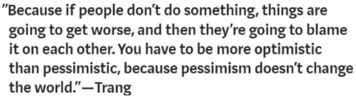 Trang, too, had come from a turbulent background. She had grown up in Saigon during the final years of the Vietnam War. As North Vietnamese forces advanced, her parents made the difficult decision to flee the country.