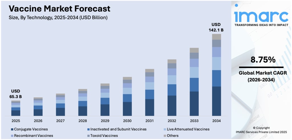 According to IMARC Group's latest research, the global vaccine market size was valued at USD 65.3 Billion in 2025. The market is projected to reach USD 142.1 Billion by 2034, at a CAGR of 8.75% during 2026-2034. Asia-Pacific currently leads the market with a dominant share of over 38.9% in 2025, driven by large-scale government immunization programs and rapidly expanding healthcare infrastructure across the region.