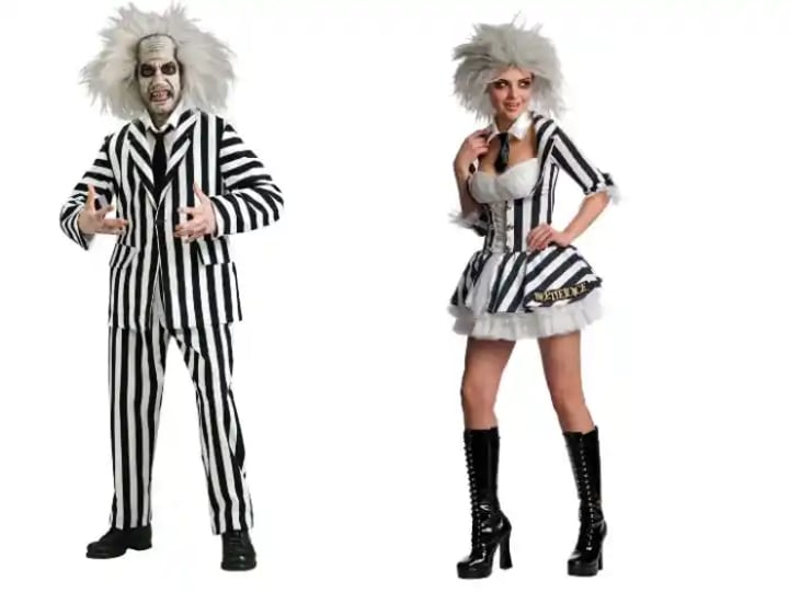 Men can buy the recognizable black and white striped suit worn by Keaton in the movie. Men's costumes also come with a crazy hair wig and a lot of face makeup.