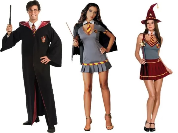 Halloween costumes for men will often go with the more rigid uniforms of the first few films. These thick wizard robes are a very simple black with red lining. They have the school crest and can be easily worn over a nice dress shirt and tie. Most people prefer the Gryffindor colors for their ties or scarves, but any house colors are acceptable.