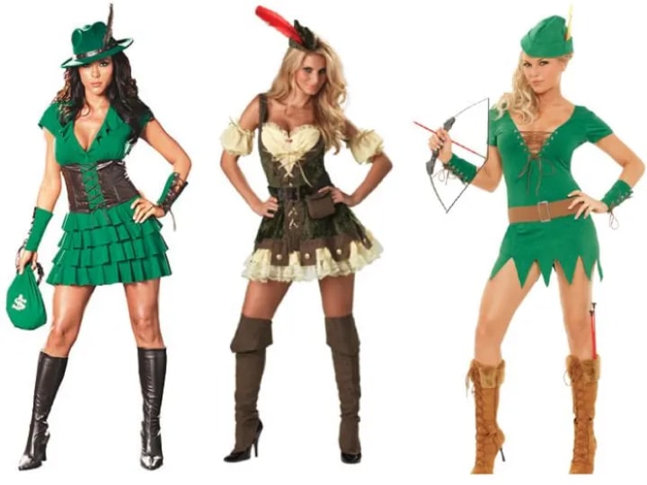 Female Robin Hood clothing leans toward the green coloring and feathered hat look. The costuming might be more fitting for another “profession” that works outside the laws of England but still takes money from the rich and gives to the poor.