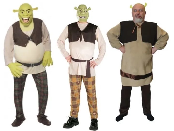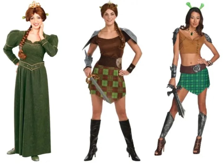 Fiona costumes can be a little more tricky. Technically she is a human that is cursed to transform into an ogre at night until she finds her true love. Not to spoil the movie, but Shrek is her true love, and she turns into an ogre permanently by the end of the first film. When designing a Fiona princess costume, they go halfway. The long thick green dress looks great, but instead of making her fully human or ogre, they make her human with the trademark ogre ears. This might be understandable till the warrior Fiona costume is put together. At this point, Fiona is a full ogre. Yet the costume makes no attempt at hiding her womanly form and instead just adds the ogre ears. It takes a lot of imagination to mistake the women wearing these costumes as ogres.