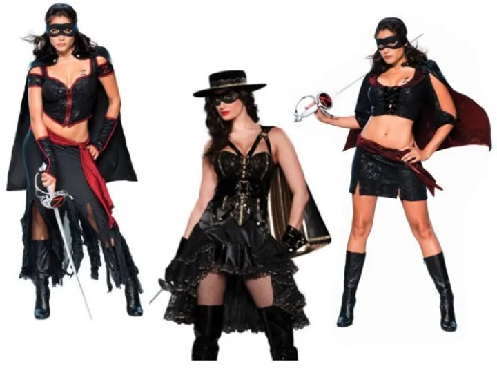 Women's costumes typically come with the black mask, boots, and cape, but from there start to vary. Most women's Zorro costumes expose the midriff by having a short halter top and then a separate skirt. The one full-bodied costume looks like a corset that might be worn at a bordello rather than in a fight. Unlike the male Zorro, who has a Z placed on his belt or hat, female Zorros seem to prefer having it drawn onto their chest. However, based on the shredded dress worn in one of the costumes, it looks like the designers forgot it was Zorro who ripped the opponent's clothing and not the other way around.