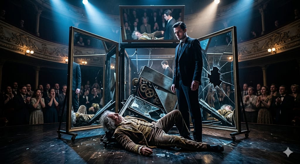 The lighting was a cold, lunar silver, casting long, razor-sharp shadows across the white marble floor. At the center of the obsidian stage sat the Mirror Box. It looked less like a magician’s prop and more like a minimalist sarcophagus, its mahogany surfaces absorbing the light while its dielectric mirrors reflected the audience back at themselves in a fractured, infinite loop.