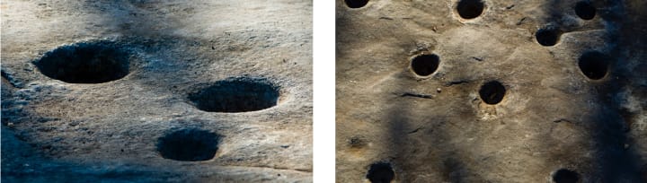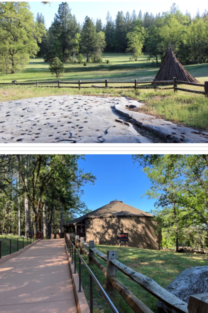 The 135-acre park preserves a great outcropping of marbleized limestone with some 1,185 mortar holes -- the largest collection of bedrock mortars in North America. A ceremonial roundhouse and reconstructed bark houses are present in the center of the park.
