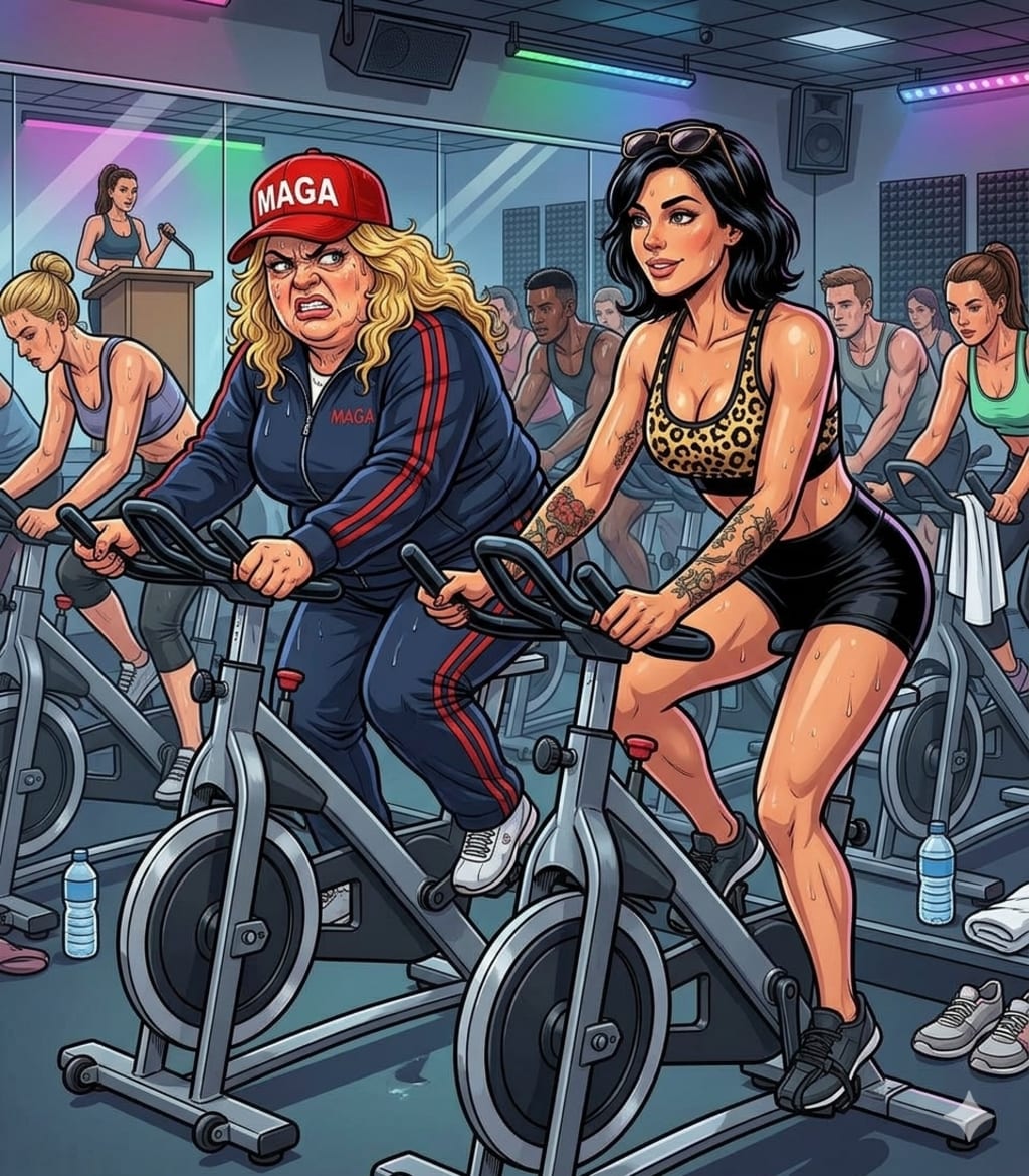 Brenda was a monument to American ego and exceptionalism. She sat atop her stationary bike like a conqueror claiming a hill, though the hill was currently vibrating violently under her weight. She was encased in a navy-blue velour warmup suit that was performing a structural miracle by not detonating under the sheer pressure of the weight of her "pure-blooded" self-righteous indignation. On her head, the crown: a pristine, red MAGA dunce cap, tilted forward like the prow of a girthy battleship.