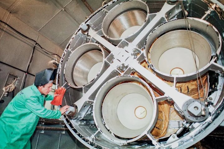 An engineer examines the engine of an SS-19 intercontinental ballistic missile in Dnipro, Ukraine, 1996. Credit: AP