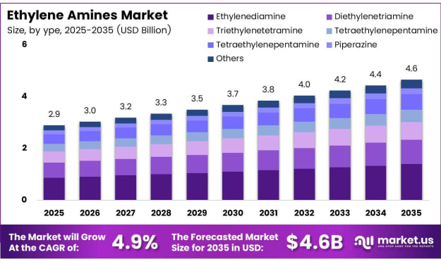Overview The Global Ethylene Amines Market is on a steady growth trajectory, projected to reach USD 4.6 billion by 2035, expanding from USD 2.9 billion in 2025 at a compound annual growth rate (CAGR) of 4.9%. Ethylene amines, a family of versatile chemical compounds including ethylenediamine (EDA) and its derivatives, serve as essential building blocks across a vast array of industries.