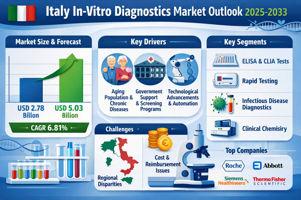 According to recent insights, the Italy In-Vitro Diagnostics (IVD) Market was valued at USD 2.78 billion in 2024 and is projected to reach USD 5.03 billion by 2033, expanding at a compound annual growth rate (CAGR) of 6.81% between 2025 and 2033 . This steady growth reflects a combination of demographic trends, technological advancements, and strong government support that continues to shape the future of diagnostics in the country.